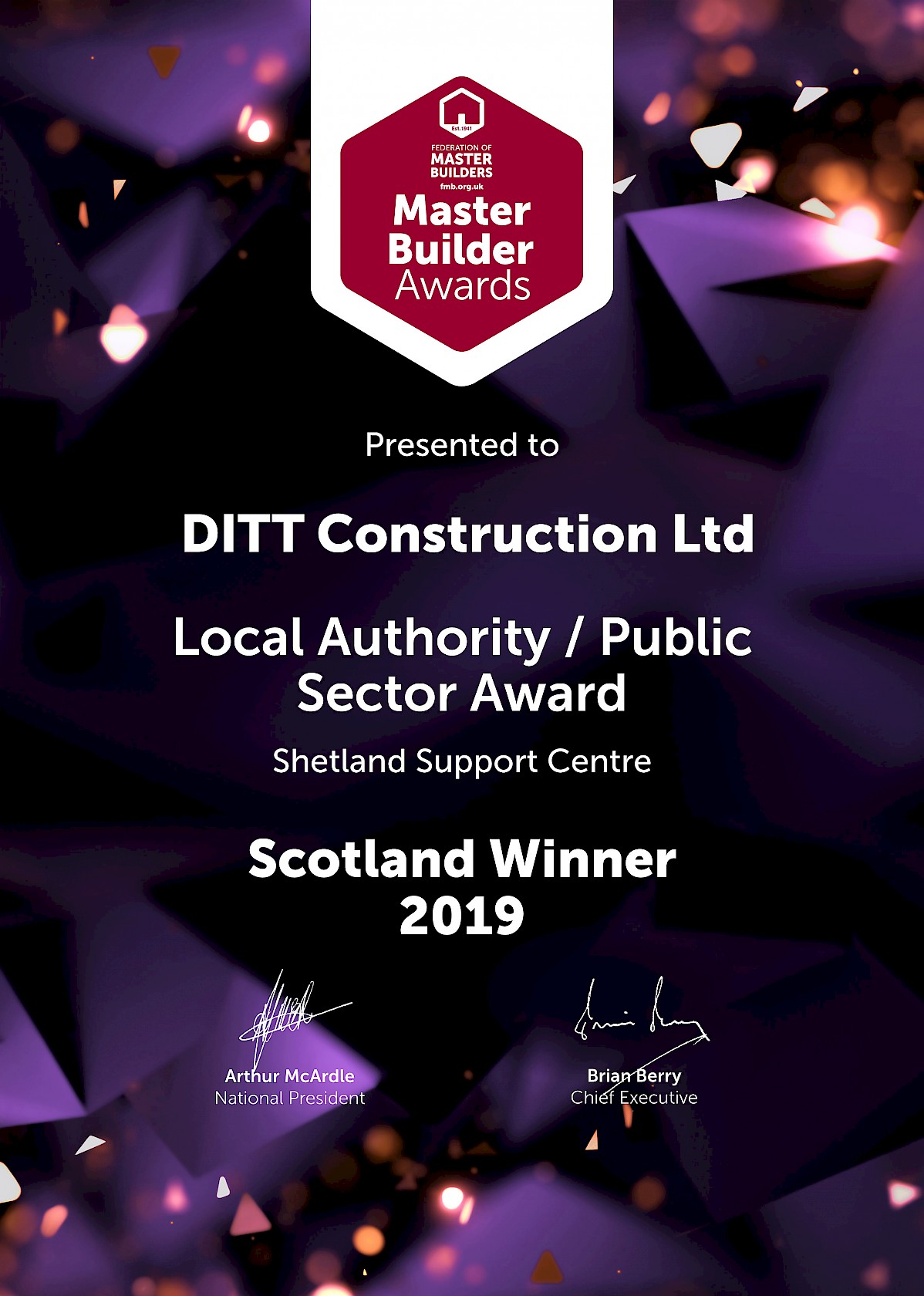 DITT Construction Ltd picked up the prize for the company’s work on the Shetland Support Centre (Eric Gray @ Seafield). The project was a new build development to provide a modern, practical building to provide specialist support for adults with learning disabilities, autistic spectrum disorders and complex needs. The project was completed to budget and the variety of material and construction methods required evidences the high quality construction management and technical skills of the DITT Construction Ltd workforce. The exposed site location, its unique features and the clear pride of the contractor in this project were noted by the judges.